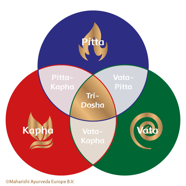 En sanskrit, ces trois doshas sont nommés Vata, Pitta et Kapha. La santé dépend de l’équilibre fonctionnel de ces trois opérateurs. Chaque individu naît avec une certaine proportion de ces doshas, mais les proportions exactes varient d’une personne à l’autre. Cette proportion détermine le type psychophysiologique. Il existe dix types classiques, issus des combinaisons des trois doshas.